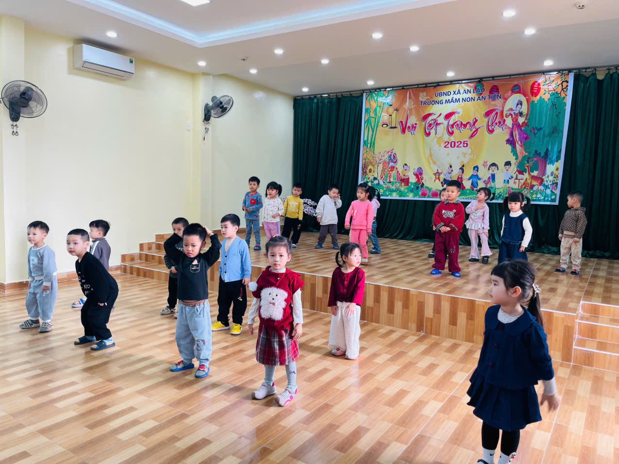 Các bài tập được giáo viên lựa chọn nhẹ nhàng, an toàn, phù hợp thể lực của trẻ 3–4 tuổi.