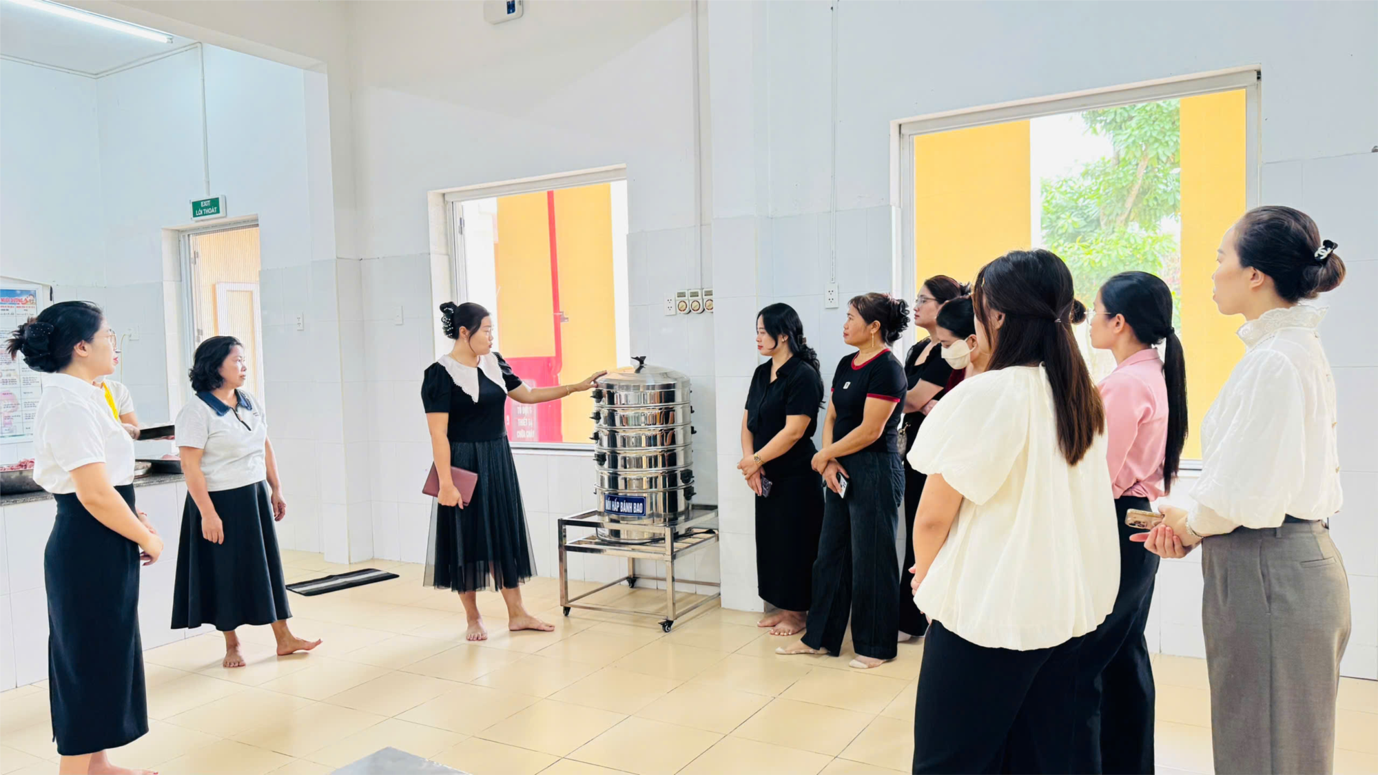 🍌 Tại buổi tham quan, ban đại diện cha mẹ học sinh đã được đồng chí hiệu trưởng cùng nhân viên nhà trường trực tiếp giới thiệu quy trình chế biến, bảo quản và lưu mẫu thức ăn. Khu vực bếp ăn được xây dựng theo mô hình bếp một chiều, đảm bảo vệ sinh an toàn thực phẩm với các khu vực riêng biệt như: khu sơ chế, khu chế biến, khu chia khẩu phần, khu rửa và khu bảo quản thực phẩm.