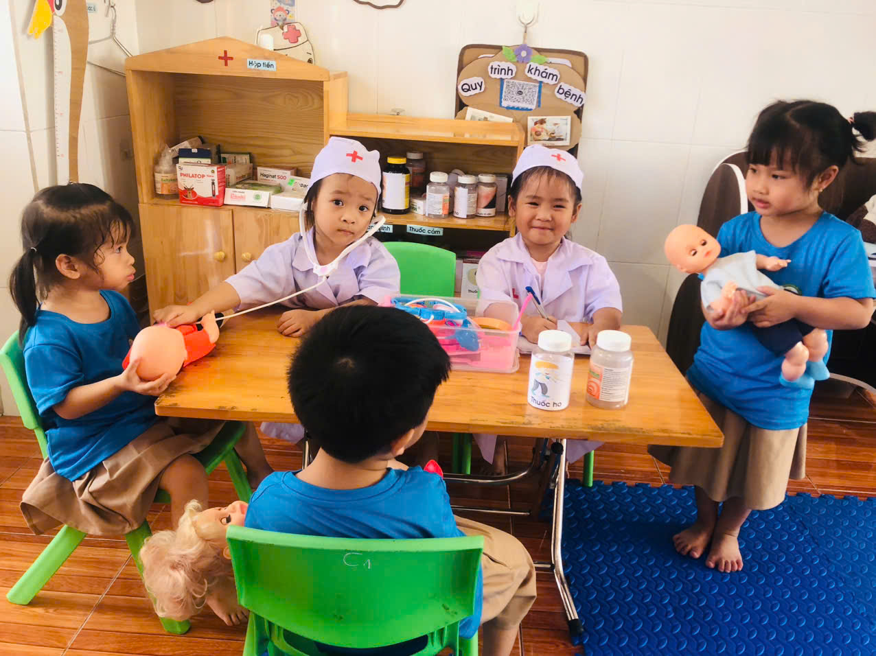 Các bé chơi góc bế em