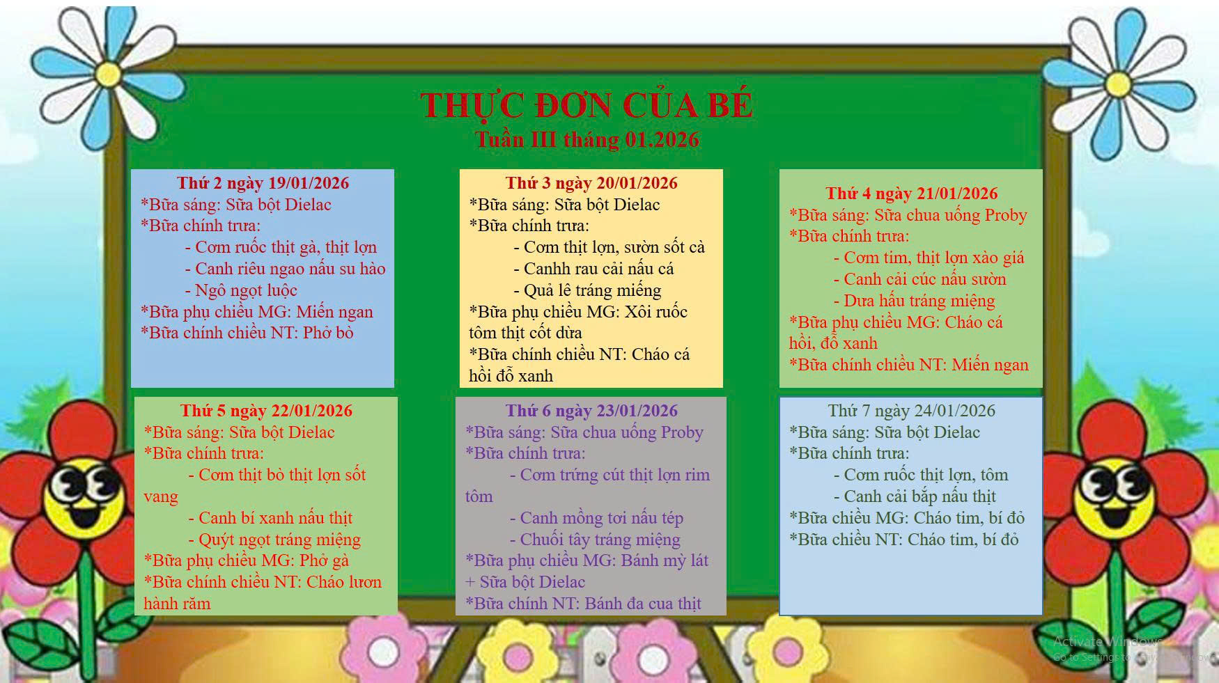 Nhằm đảm bảo cho các bé có chế độ dinh dưỡng cân đối – an toàn – phù hợp với lứa tuổi mầm non, nhà trường đã xây dựng thực đơn Tuần III tháng 01/2026 với các món ăn đa dạng, thơm ngon, giàu dưỡng chất, giúp bé khỏe mạnh và phát triển toàn diện 💪👶