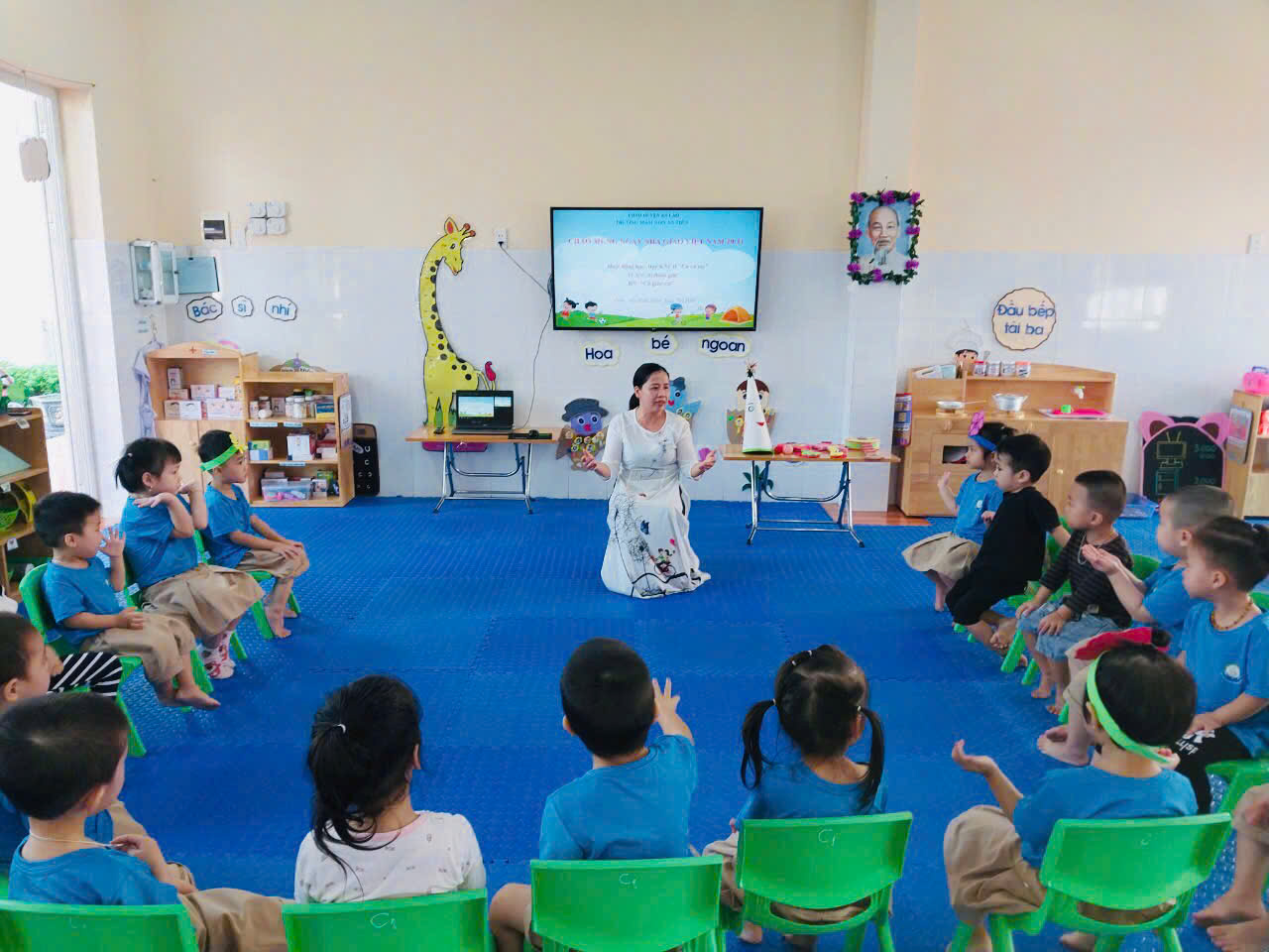 Trong tiết học này, các bé được cô dạy kỹ năng ca hát bài “Cô và mẹ”. Cô giáo hướng dẫn trẻ hát các câu hát, dễ nhớ, vui vẻ, thích thú, tạo không khí thân mật, gắn kết. Tiết dạy hát "Cô và mẹ" không chỉ dừng lại ở việc rèn luyện kỹ năng ca hát mà còn bồi dưỡng tình cảm và phát triển sự tự tin cho trẻ. Những ánh mắt long lanh, sự hồn nhiên và niềm vui hiện lên trên khuôn mặt các bé khi nghĩ đến cô giáo, mẹ thân yêu của mình đã tạo nên không khí lớp học thật ấm áp!