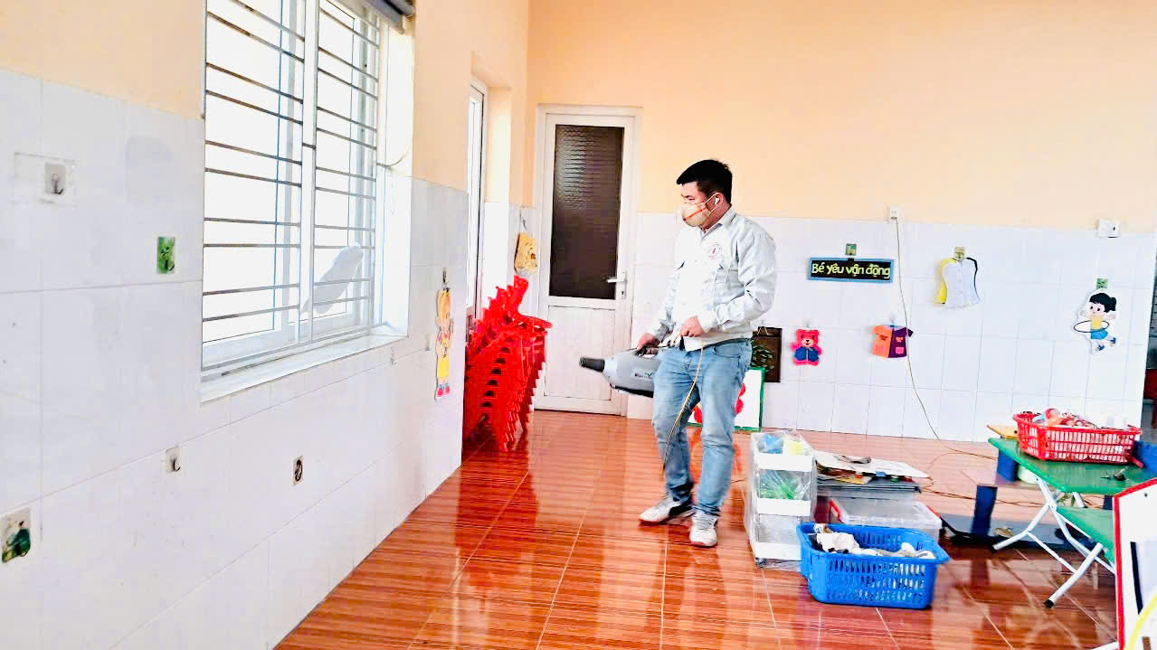 Các chú bên dịch tễ phun thuốc diệt muỗi trong và ngoài lớp học để đảm bảo an toàn vệ sinh cho các con!