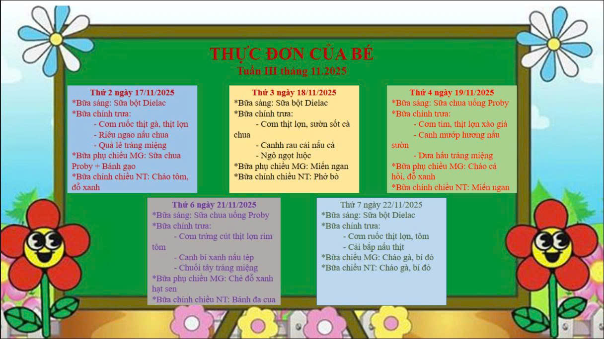 Nhà trường xin gửi tới quý phụ huynh thực đơn dinh dưỡng của các bé trong tuần 3 tháng 11. Các bữa ăn được xây dựng bảo đảm đủ chất – cân đối – phong phú, giúp bé ngon miệng và phát triển toàn diện mỗi ngày.