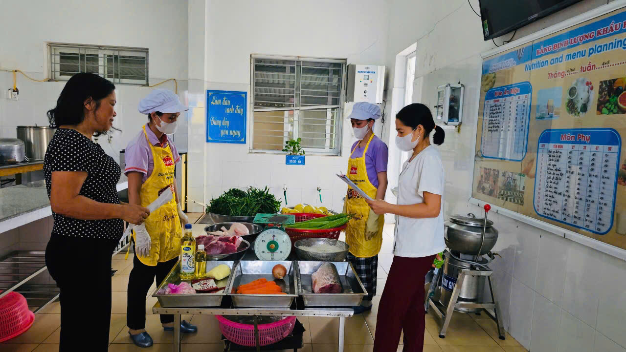 Nhà trường luôn thực hiện nghiêm túc việc niêm yết công khai danh mục nguồn gốc thực phẩm, ký cam kết bảo đảm an toàn thực phẩm, đồng thời phân công cán bộ, nhân viên theo dõi hàng ngày việc tiếp nhận thực phẩm, ký giao nhận thực phẩm, chế biến và kiểm thực 3 bước.
