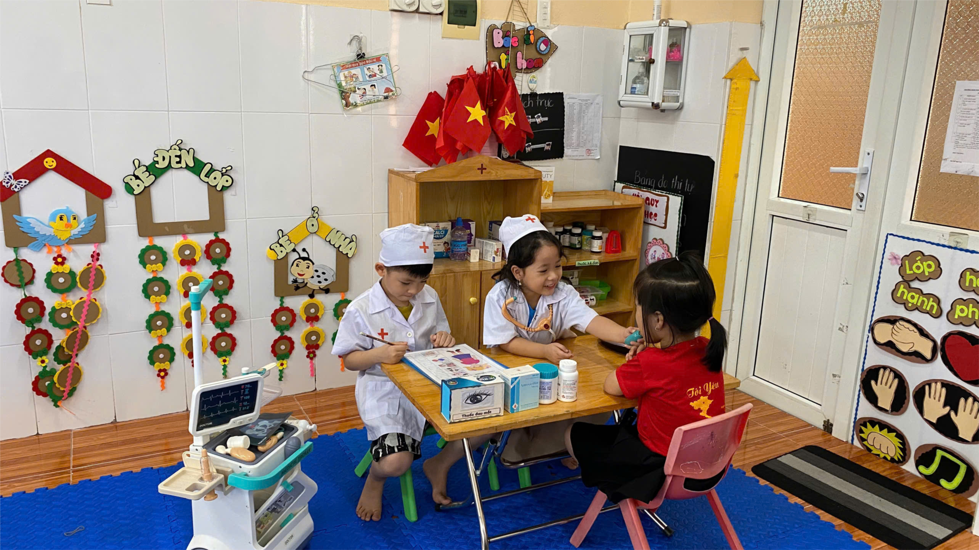 Trong giờ hoạt động vui chơi, các bé lớp 5 tuổi A2 trường Mầm non An Tiến say mê tham gia ở các góc khác nhau. Ở góc xây dựng, các bạn trai khéo léo xếp những khối gạch thành hàng rào, vườn hoa, tạo nên một khuôn viên nhỏ xinh đầy màu sắc. Ở góc bác sĩ, các bạn gái hóa thân thành những “y bác sĩ nhí” tận tình khám bệnh cho bệnh nhân, nét mặt vừa nghiêm túc vừa đáng yêu. Mỗi góc chơi đều vang lên tiếng cười rộn ràng, thể hiện sự sáng tạo, tinh thần hợp tác và niềm vui hồn nhiên của tuổi thơ. Những hoạt động ấy không chỉ giúp trẻ phát triển trí tuệ, kỹ năng mà còn mang lại những kỷ niệm đáng nhớ trong mái trường mến yêu.