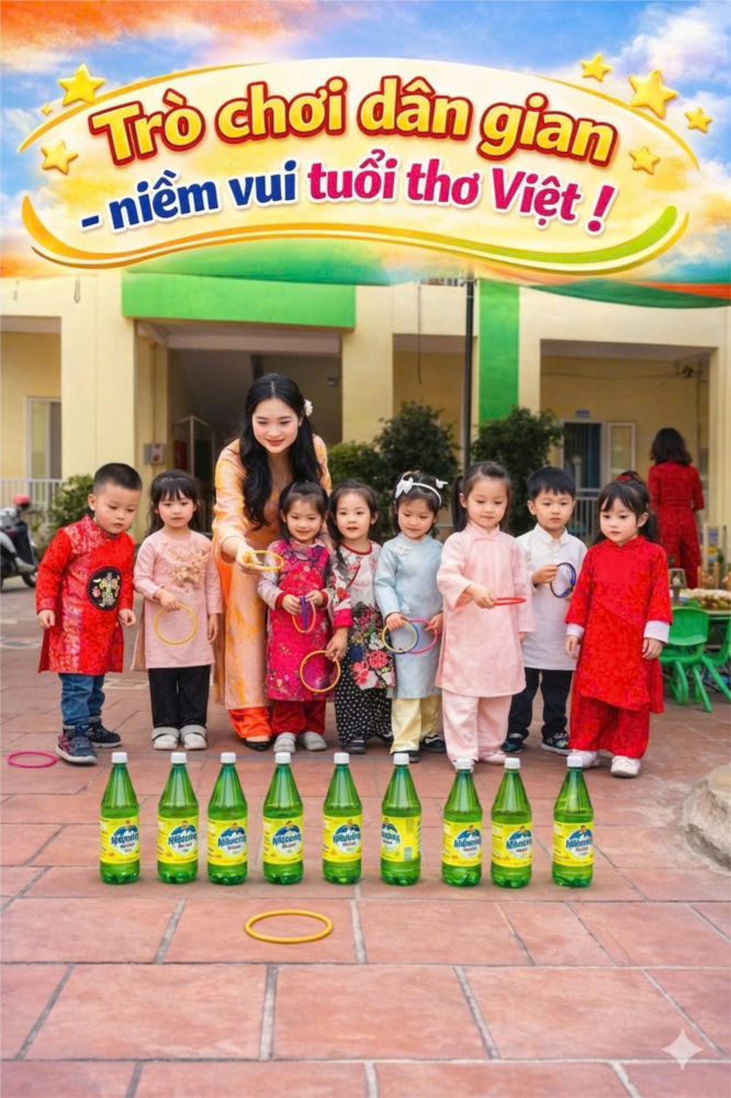 Từ những vật liệu quen thuộc như chai nhựa, vòng nhựa, nắp chai…, các cô giáo đã khéo léo thiết kế thành những trò chơi dân gian hấp dẫn. Trong đó, trò chơi ném vòng cổ chai được các bé đặc biệt yêu thích. Các chai nhựa được xếp ngay ngắn trên sân, các bé lần lượt ném vòng để sao cho vòng rơi trúng cổ chai. Trò chơi không chỉ mang lại tiếng cười vui vẻ mà còn giúp trẻ rèn luyện sự khéo léo, khả năng tập trung và phối hợp vận động.