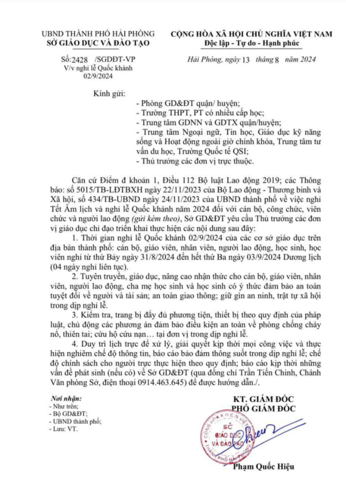 THÔNG BÁO LỊCH NGHỈ LỄ QUỐC KHÁNH 2/9/2024