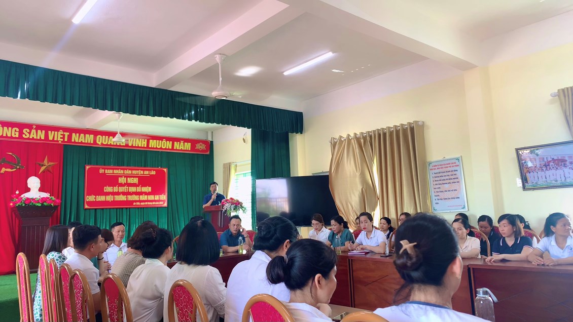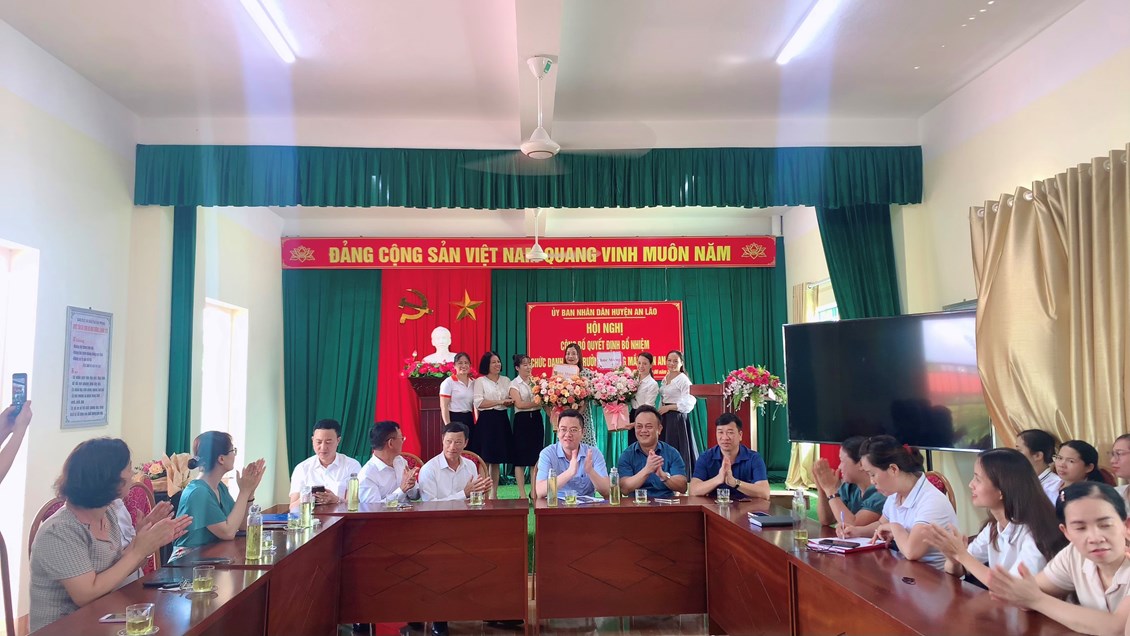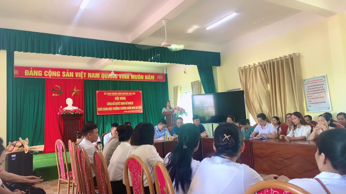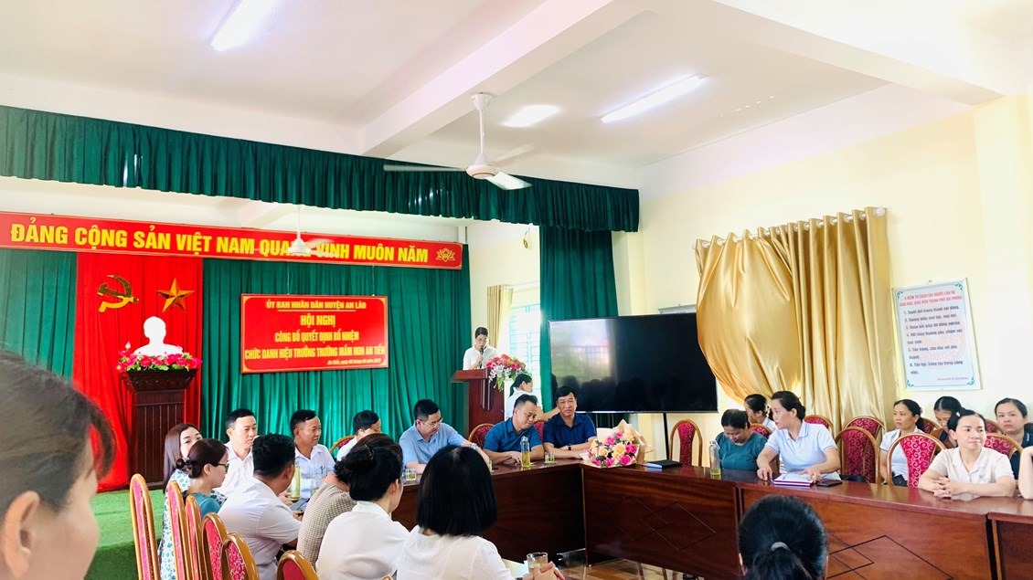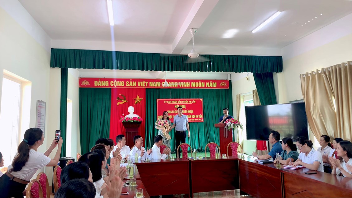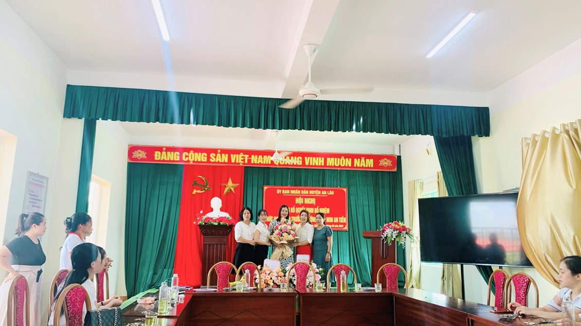 Đ/c Nguyễn Mạnh Thắng - Huyện ủy viên - Phó chủ tịch UBND Huyện An Lão đã trao quyết định, tặng hoa chúc mừng và phát biểu giao nhiệm vụ cho đồng chí Bùi Thị Ngọc Lan tân Hiệu trưởng Trường Mầm non An Tiến. Yêu cầu đồng chí tiếp tục phát huy tốt vai trò trách nhiệm của mình ở môi trường mới, hoàn thành xuất sắc mọi nhiệm vụ được giao.