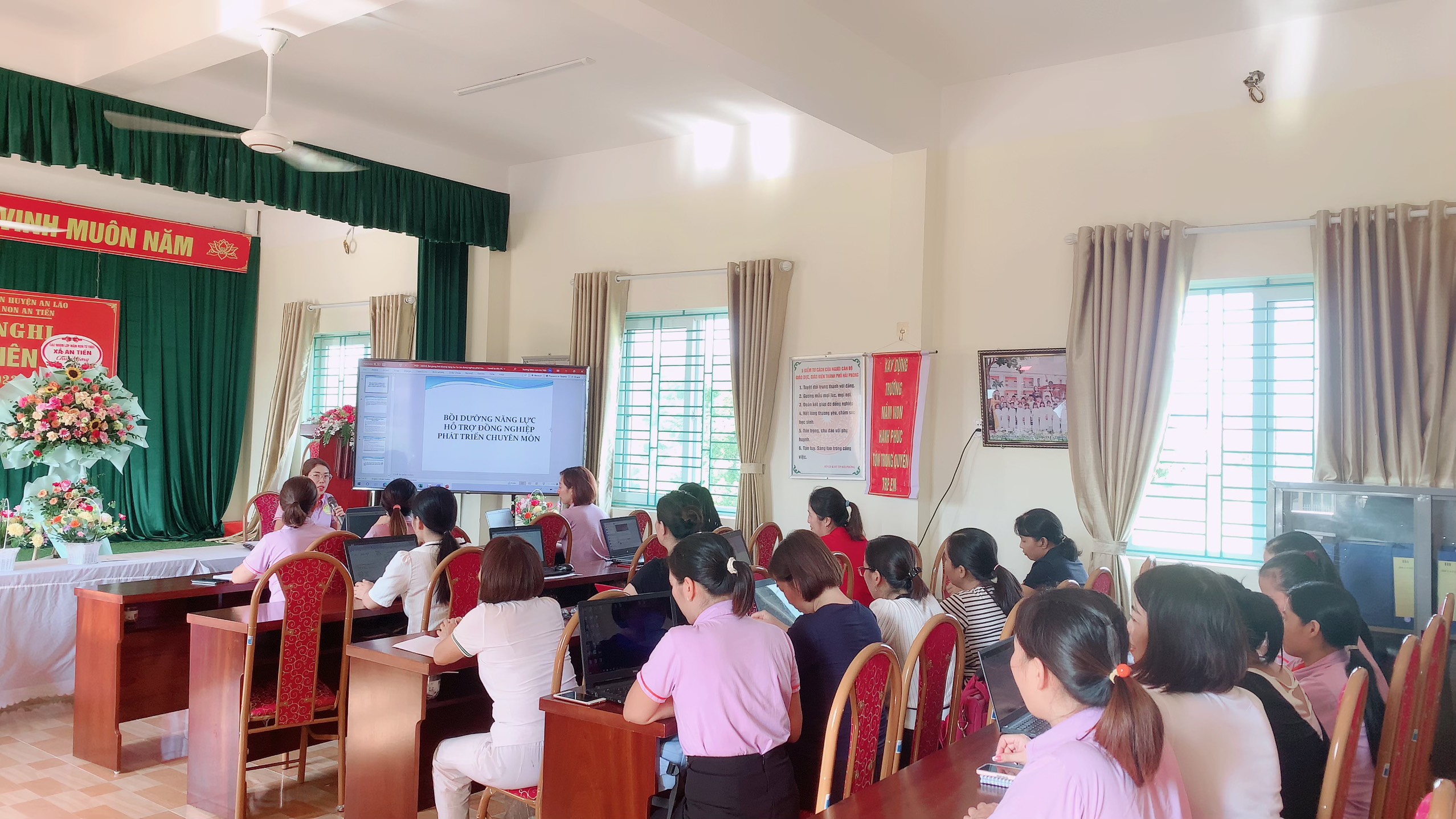 Ngày 29/8/2023 trường MN An Tiến tổ chức bồi dưỡng chuyên môn cho đội ngũ giáo viên, nhân viên toàn trường nhằm nâng cao năng lực chuyên môn cho đội ngũ giáo viên, đáp ứng yêu cầu đổi mới giáo dục. Lớp tập huấn tập trung vào các nội dung: Ứng dụng công nghệ thông tin trong phát triển chuyên môn cho giáo viên mầm non; tổ chức công tác bán trú tại các cơ sở Giáo dục mầm non trong giai đọan hiện nay; Giáo dục hòa nhập trẻ khuyết tật; Xây dựng trường học hạnh phúc.100% các đ/c GVNV học tập nghiêm túc, đúng giờ. Qua buổi tập huấn, đội ngũ GVNV đã nắm được kiến thức cơ bản, trọng tâm để thực hiện nhiệm vụ năm học mới.