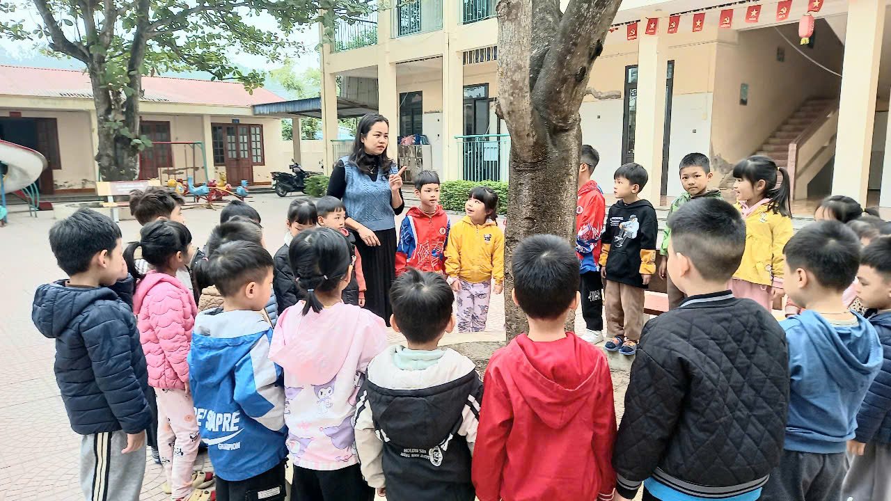 Cô giáo cùng các bé quan sát và trò chuyện về cây phượng