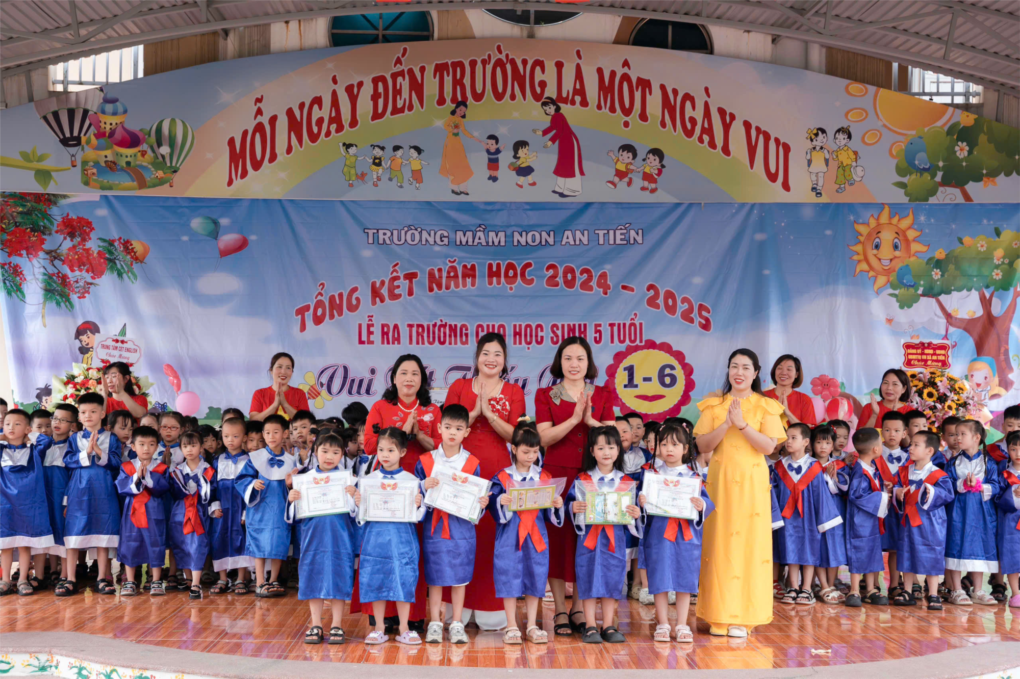 Sáng nay, sân trường Mầm non An Tiến bừng sáng bởi nụ cười trong veo và trang phục rực rỡ của các bé lớp 5 tuổi trong buổi chụp ảnh kỷ yếu cuối năm.