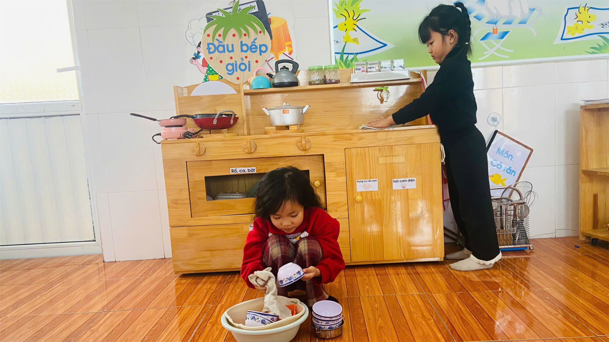 Tham gia dọn dẹp lớp học, trẻ sẽ hiểu được tầm quan trọng của việc giữ gìn vệ sinh và bảo vệ môi trường xung quanh. Trẻ được hướng dẫn cách lau bàn, lau đồ dùng đồ chơi, sắp xếp đồ dùng học tập đúng chỗ, từ đó hình thành thói quen tốt và ý thức tự giác. Không những thế, khi tham gia dọn vệ sinh, trẻ được làm việc cùng nhau, học cách phối hợp, chia sẻ công việc và giúp đỡ bạn bè. Đây là cơ hội để trẻ rèn luyện kỹ năng giao tiếp và tinh thần đoàn kết. Một lớp học sạch đẹp với trang trí mới mẻ không chỉ mang đến không khí Tết rộn ràng mà còn giúp trẻ cảm nhận được sự hân hoan, háo hức khi chờ đón năm mới.