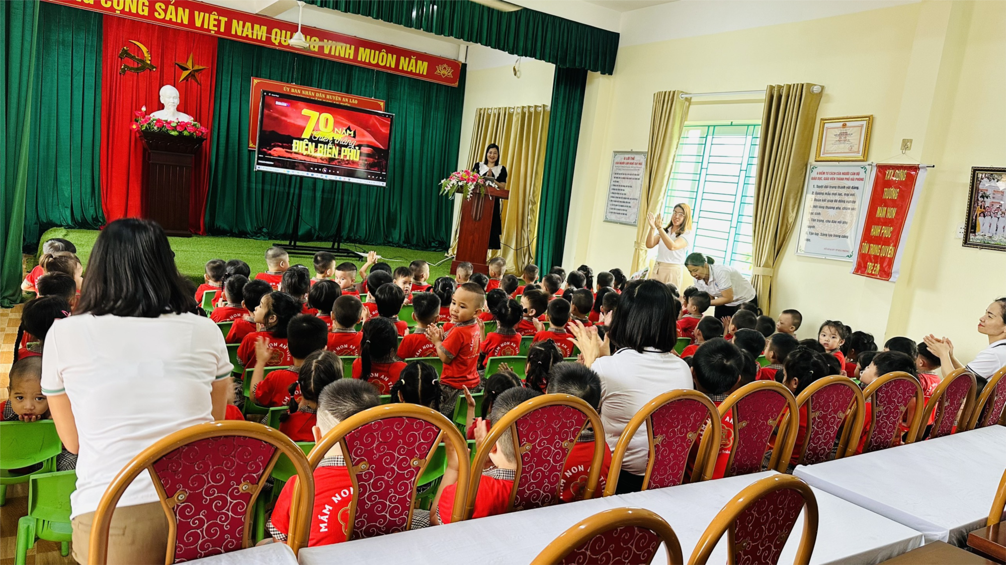 Hòa chung không khí hào hùng của toàn dân tộc hướng tới lễ “Kỷ niệm 70 năm chiến thắng Điện Biên Phủ và 49 năm giải phóng miền Nam thống nhất đất nước 30/4/1975 - 30/4/2024”. Sáng ngày 22/4/2024 cô và trò trường Mầm non An Tiến hân hoan tổ chức các hoạt động như: Xem các phóng sự tư liệu lịch sử, tham gia các hoạt động tái hiện lại cảnh quân và dân ta chiến thắng giành độc lập tự do, thống nhất đất nước, hô vang khẩu hiệu “ Độc lập tự do muôn năm”, hát vàng lời ca “ Như có Bác hồ trong ngày vui đại thắng”…