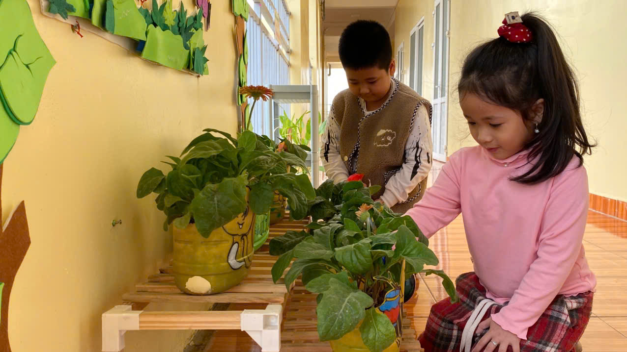 Tại góc thiên nhiên, các bé được trực tiếp tham gia vào các hoạt động chăm sóc cây như: tưới nước, quan sát sự phát triển của lá, hoa; nhận biết màu sắc, hình dáng của cây và tìm hiểu lợi ích của cây xanh đối với cuộc sống. Dưới sự hướng dẫn của cô giáo, trẻ hứng thú, tích cực và thể hiện tinh thần trách nhiệm khi cùng nhau chăm sóc cây.