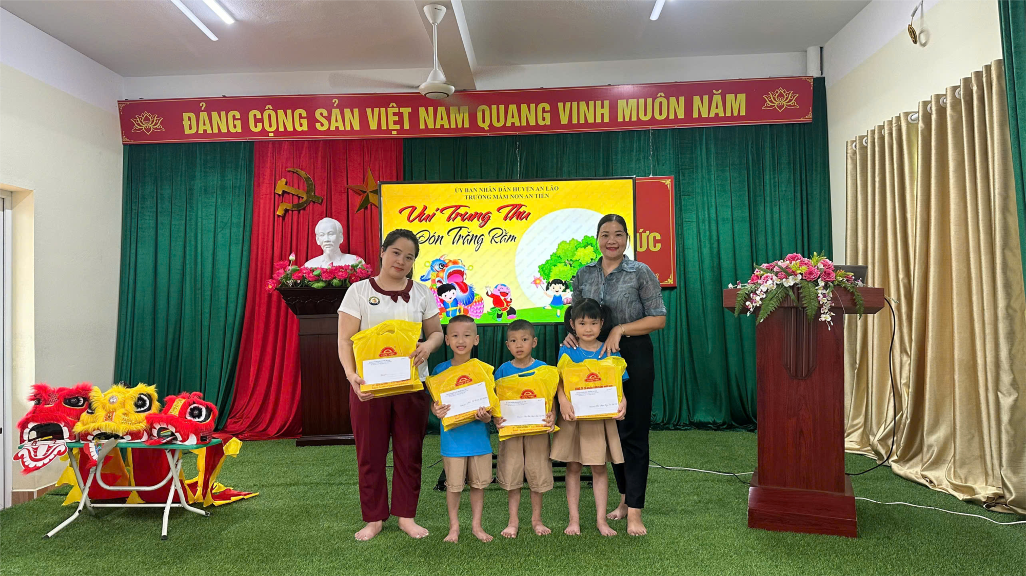 Do ảnh hưởng của cơn bão số 3 YAGI, các nhà trường phải tập trung khắc phục hậu quả sau bão nên UBND huyện hoãn lại chương trình và tổ chức xuống trao quà tại một số địa phương xã, thị trấn. Trường mầm non An Tiến vinh dự được thừa ủy quyền của UBND Huyện An Lão trao 4 xuất quà Tết Trung thu cho 4 em học sinh có hòan cảnh khó khăn trong nhà trường.