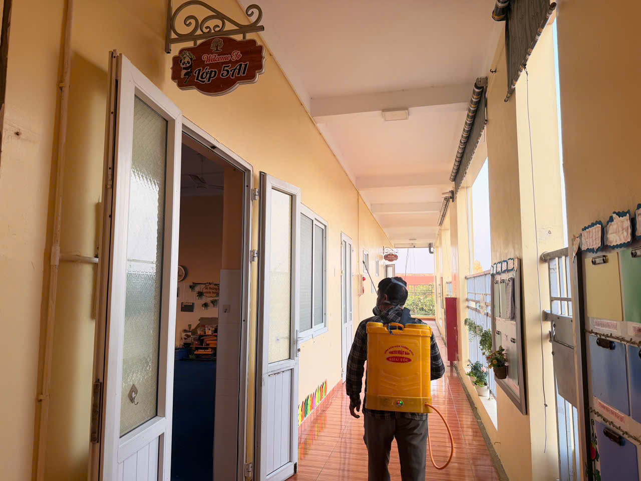 Tại lớp 5 tuổi A1, ngay từ sáng sớm, cô giáo chủ nhiệm đã có mặt tại lớp để giám sát, phối hợp và trực tiếp cùng tham gia dọn dẹp, sắp xếp đồ dùng, đồ chơi, vệ sinh lớp học trước khi tiến hành phun thuốc. Các khu vực trong và ngoài lớp học được kiểm tra kỹ lưỡng nhằm đảm bảo việc phun thuốc diễn ra đúng quy trình, an toàn và hiệu quả.