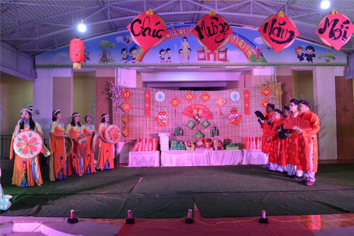 “Hội chợ xuân yêu thương - Tết sum vầy” diễn ra từ ngày 29/01/2024 đến ngày 02/02/2024 tại khuôn viên của nhà trường, thu hút rất đông các bậc phụ huynh học sinh và các bé sinh tham gia. Đặc biệt tối ngày 01/02/2023 các bé cùng phụ huynh được tham dự chương trình Văn nghệ chào xuân với các tiết mục văn nghệ thật đặc sắc và ấn tượng do các bé cùng kết hợp với cô giáo, phụ huynh và thầy giáo trung tâm dạy Tiếng Anh CET biểu diễn.